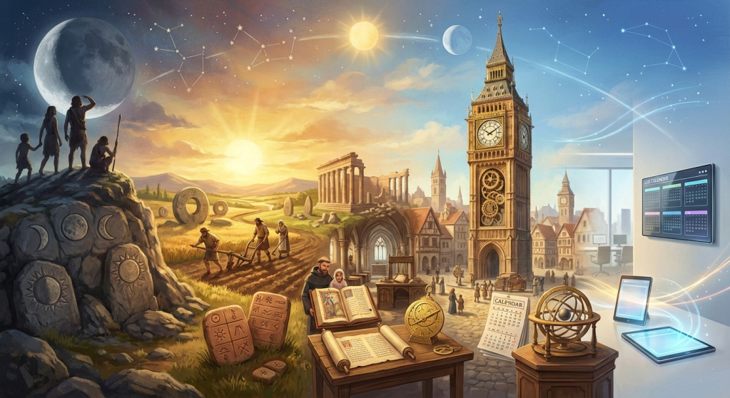 As primeiras sociedades não precisavam de calendários para marcar reuniões, mas para sobreviver. Olhavam para o céu para saber quando plantar, quando colher, quando esperar a cheia do rio ou o frio do inverno. O tempo era observado, não dominado. Depois veio a necessidade de organizar cidades, impérios, impostos, rituais, mercados. O tempo precisou ser alinhado, padronizado, sincronizado. E assim ele virou sistema.